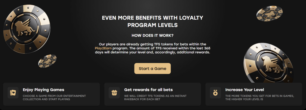 A fundamental element of the Fairspin loyalty structure is the loyalty points system, powered by the TFS Token. Players can collect tokens during every single game, which can later be exchanged for bonuses, free spins, cash, or held in the Hold to Earn program for passive rewards. Loyalty points are collected quickly, and the more actively you play, the more benefits you can access.